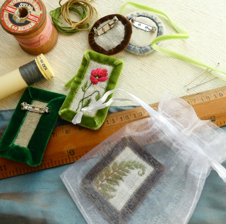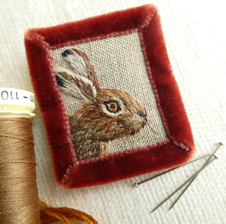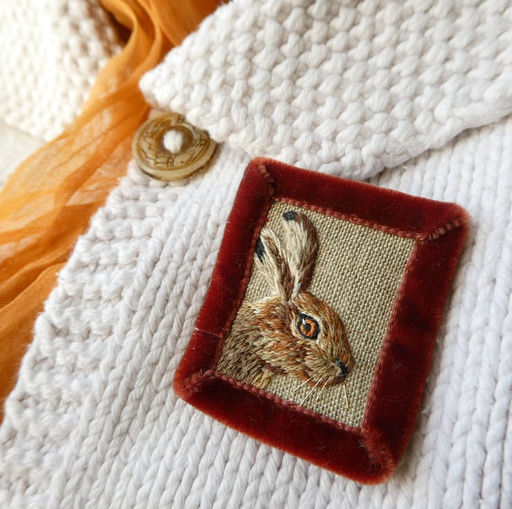 This Hare was sewn by hand onto fabric pieces with embroidery thread and a tiny bit of gold thread. It has an edge of a rust coloured velvet ribbon for strength and a luxurious touch. There is a brooch pin with a safety catch stitched onto the reverse to keep it nice and secure. It is shown in natural light to give the best idea of the colours but remember that screens do vary. The brooch measures about 4cm x 5cm and will be sent in a small white organza bag.