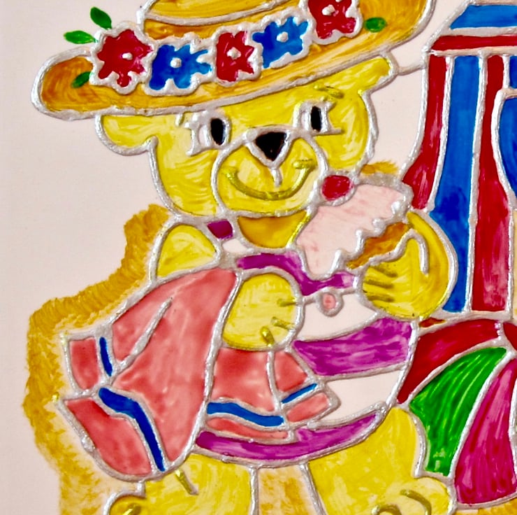 I was going through my 'glass painting' phase. I had discovered glass paints and the wonderful jewelled colours and gem-like images they produced on windows, when I thought I would turn my attention to some wall tiles I had left over from redecorating my bathroom.