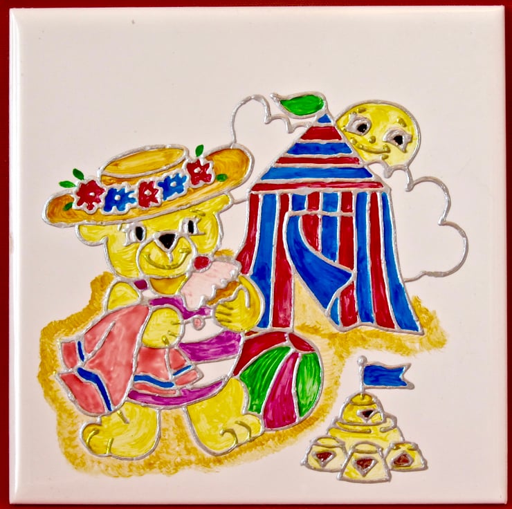 Hand Painted 'Bear at the Beach', 15cm square ceramic tile