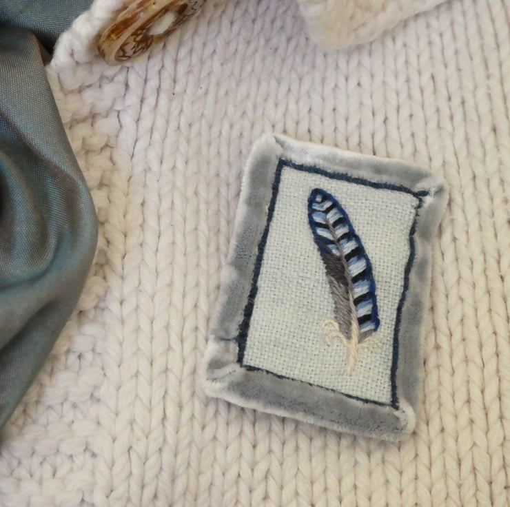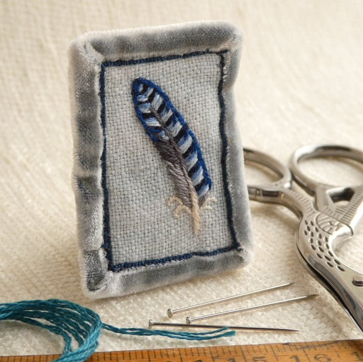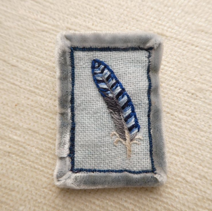 This little jay feather embroidery was hand stitched onto a piece of linen and edged with shimmery velvet ribbon for a luxurious feel. There is a brooch pin with a safety clasp on the reverse for security. I've shown it in natural light to give the best idea of the colours but remember that screens do vary. It is about 3.5cm x 4.5cm and will be sent in a small organza bag.