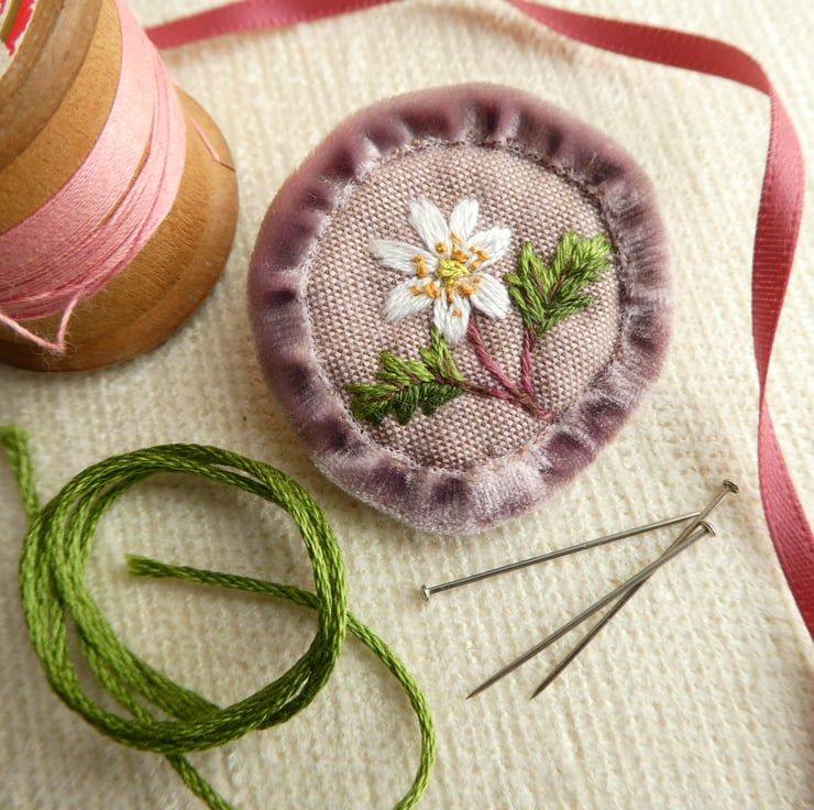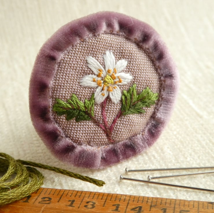 Hand embroidered circle brooch with a wood anemone, edged with silky velvet ribbon for a touch of luxury - a small bit of wearable art.