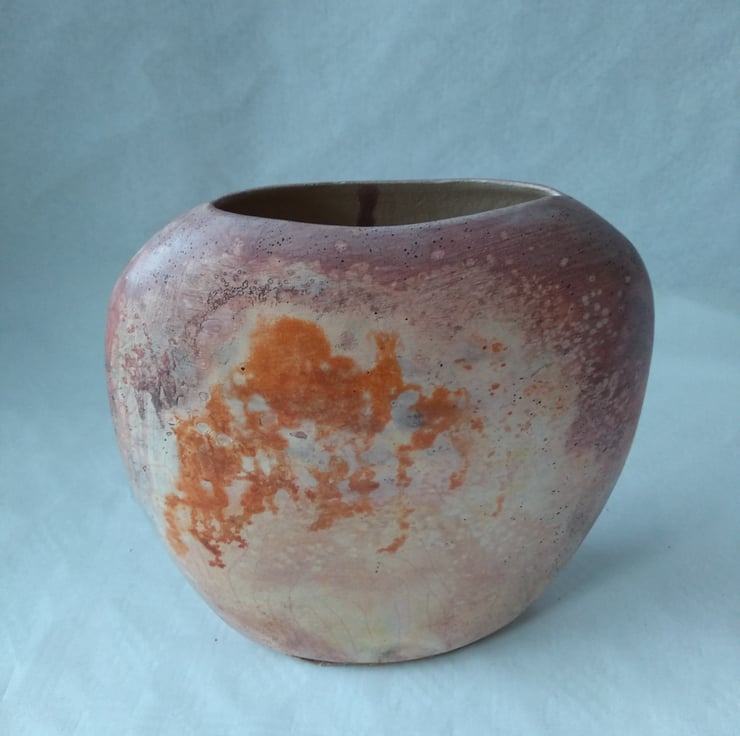 I have recently become fascinated with the effects of Ferric Chloride on pots fired in my raku gas kiln. The process is exciting and the results are unpredictable. Each item is fragile and unique.