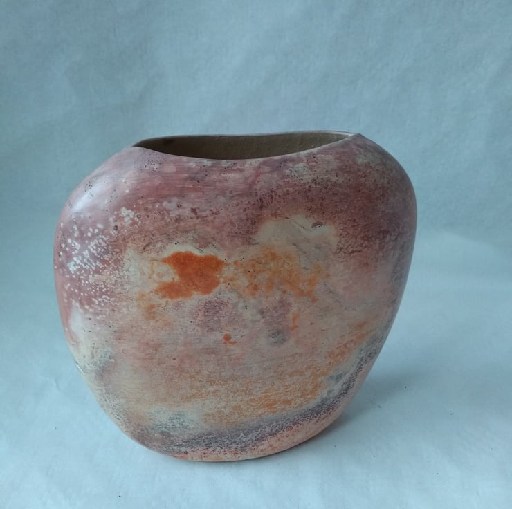This is an earthenware vase. The unique pattern on the outside results from using Ferric Chloride in a gas kiln. The vase is not glazed on the inside so it is porous.