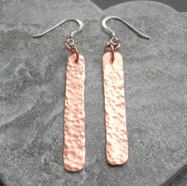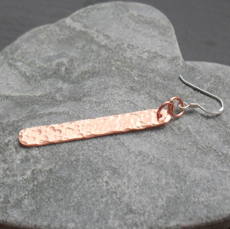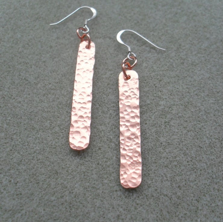 Long pieces of copper which have been hand cut from a sheet of copper have been hammered to give texture and are attached to sterling silver ear wires with copper jump rings.