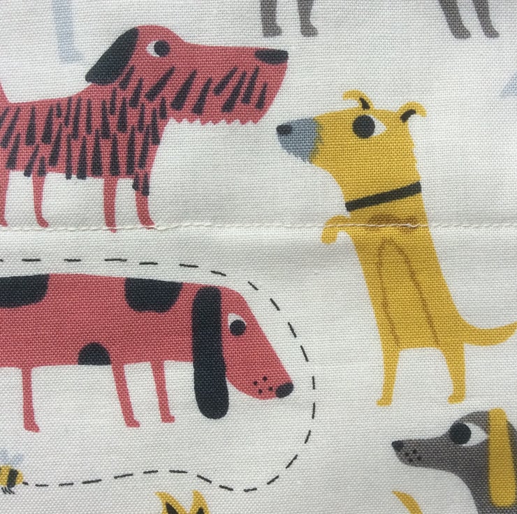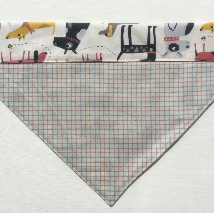 This cute, over the collar, slide on, large dog bandana is handmade from cotton fabric with dogs on a cream background. It is lined with a grey gridded cotton fabric.