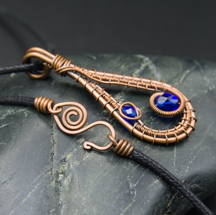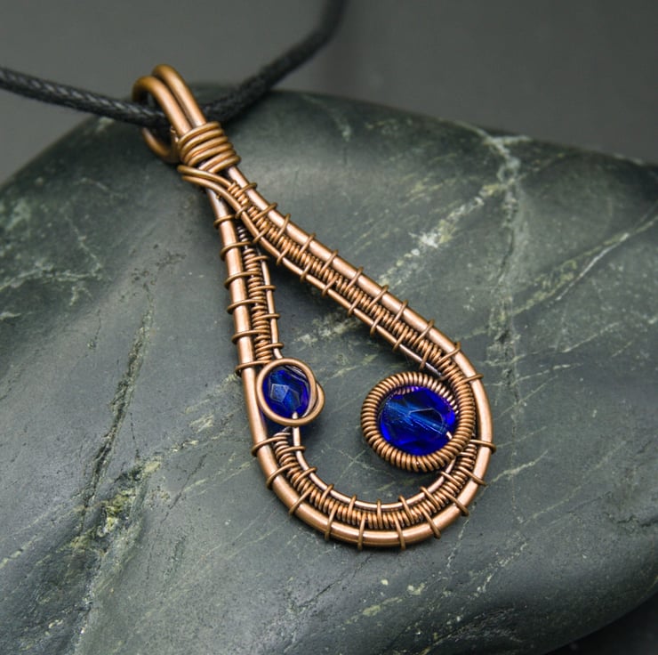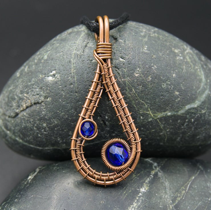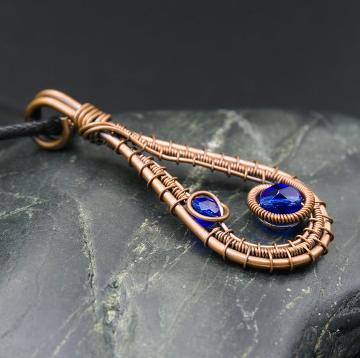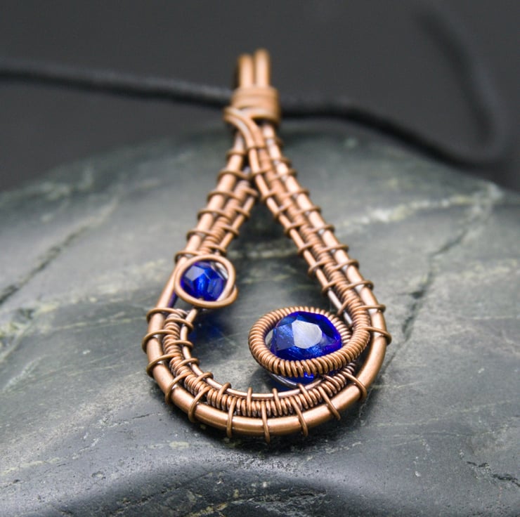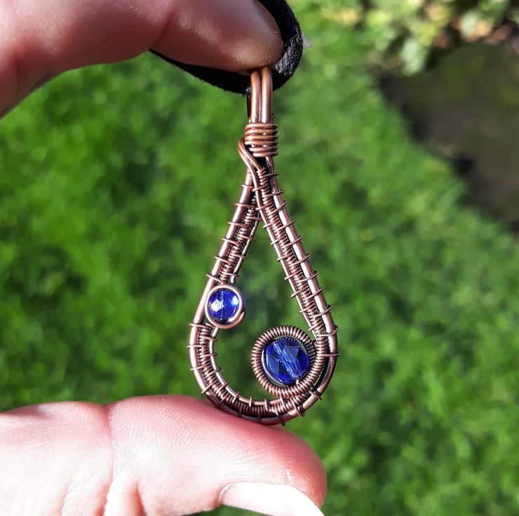 This pretty pendant is made from copper wire. I've formed a drop shape from thicker wire, & have woven finer wires within, adding two glass beads along the way. The beads are faceted & are a gorgeous royal / sapphire blue colour which looks lovely with copper.