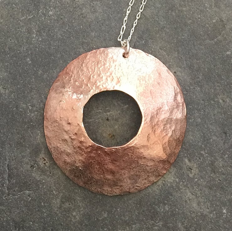This beautiful pendant is hand forged from copper which has been hand sawed, hammered and shape. It has been aged through corrosion before being cleaned up, given a slight and partial silver plating and then polished to a lovely iridescent finish.