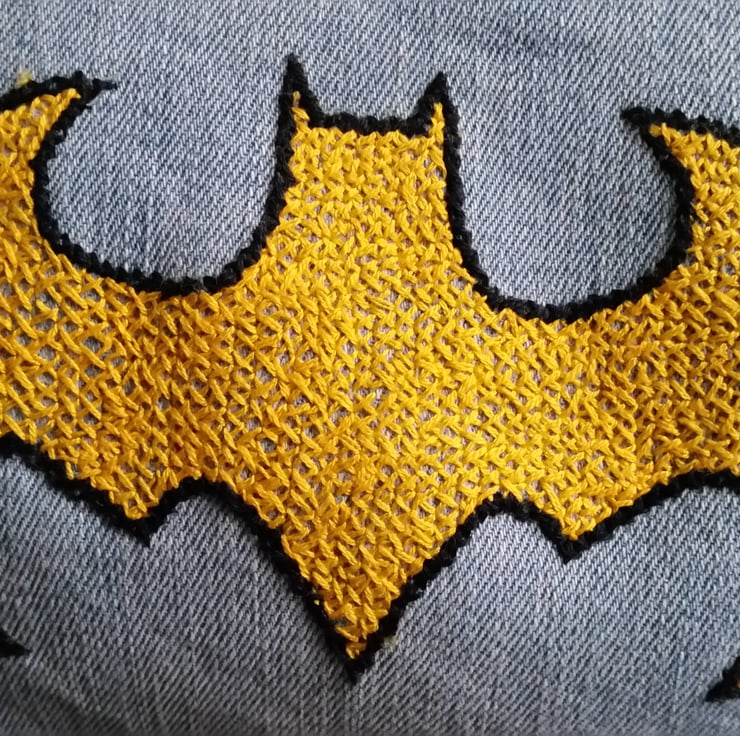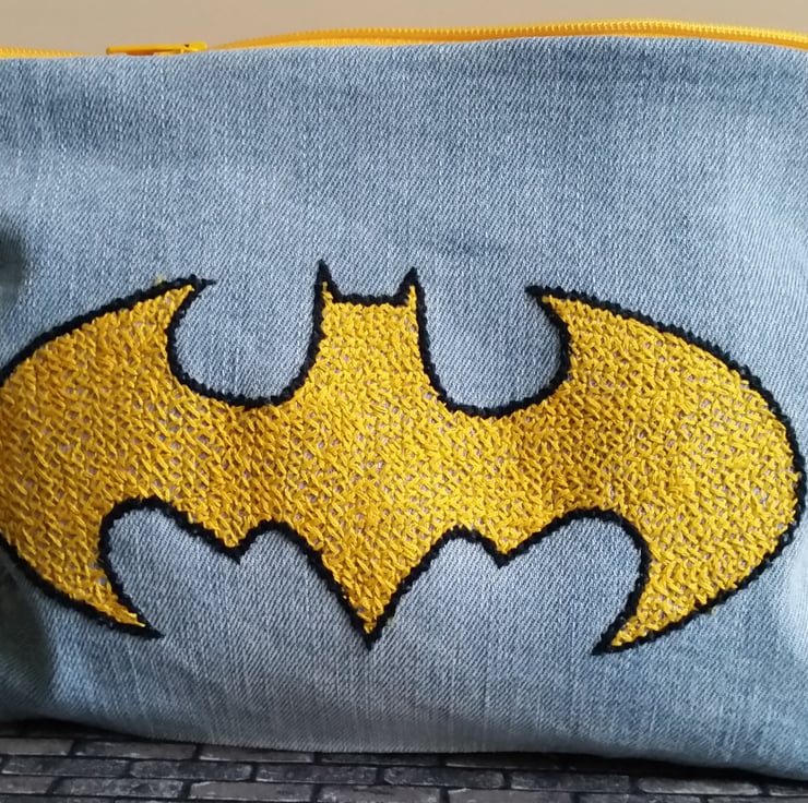 We love upcycling denim. Legs are perfect for making pouches. Lane's embroidery and colour choice is second to none. It seemed to perfectly suit the bold, bright yellow Batman logo, creating a striking contrast that truly pops! Voila!
