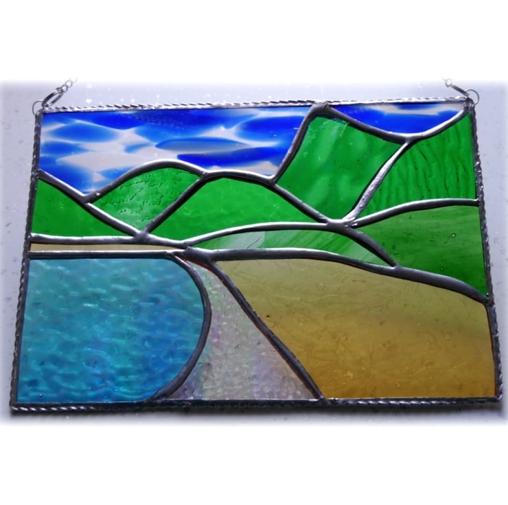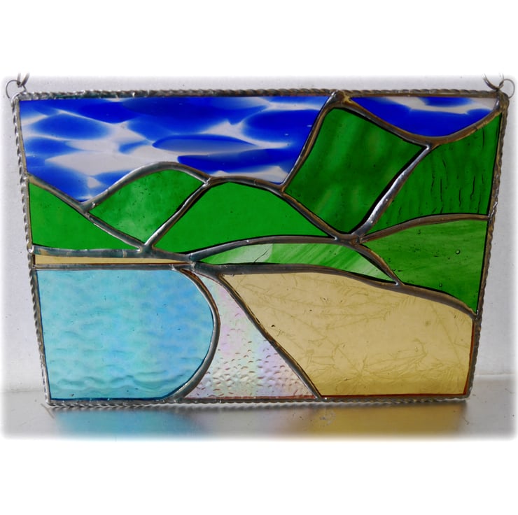 This stained glass picture is 5.5 x 7.5 inches. It is designed to hang as a suncatcher in the window and I have 'framed' it for strength with twisted wire.