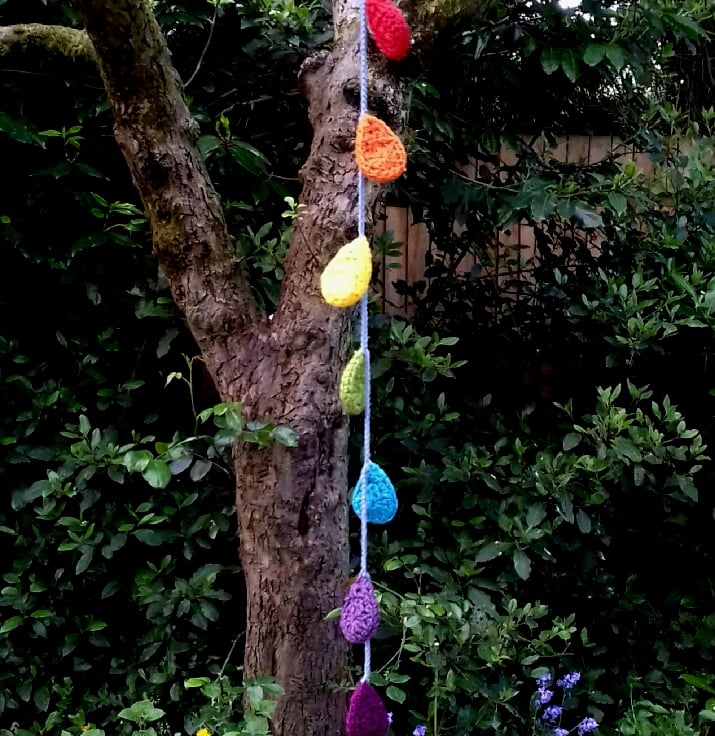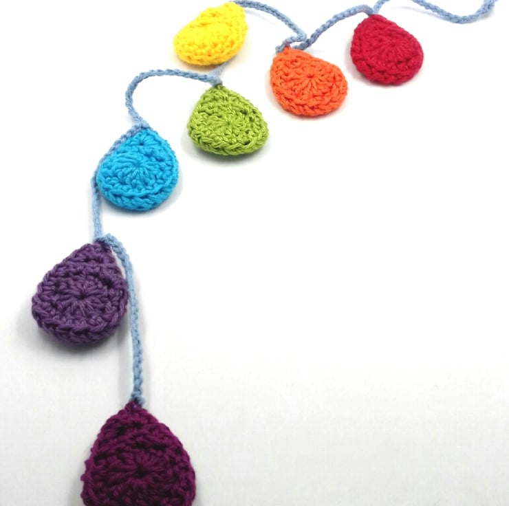 This bright and cheery hanging decoration is crocheted in cotton and features 7 raindrops in the colours of the rainbow hanging from a pale blue crocheted 'string'.