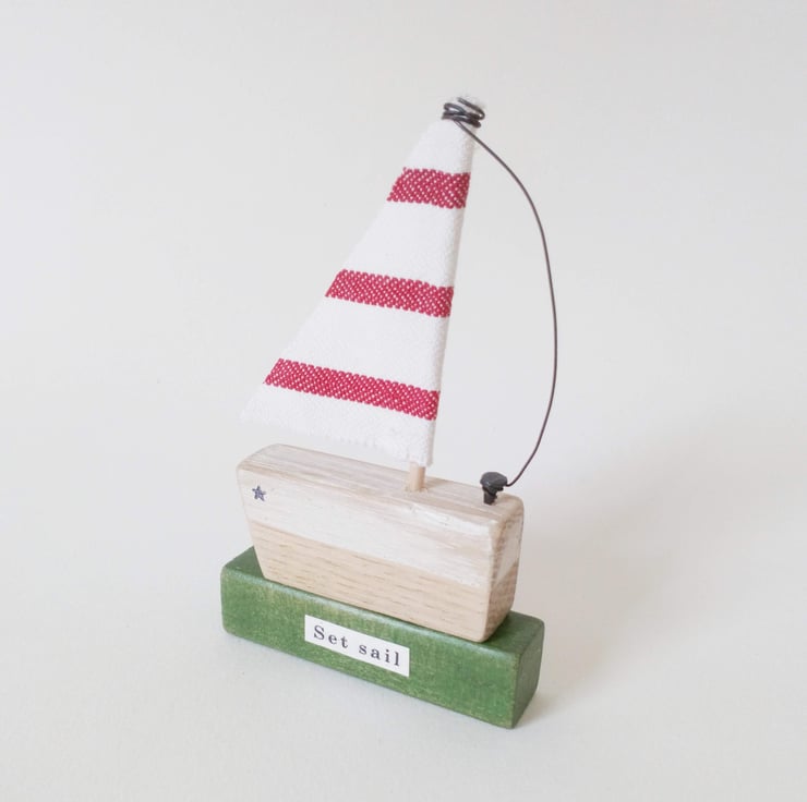 The fabric sail is wound with wire to the wood mast and the boat sits on a vintage reclaimed toy block printed with the words 'Set Sail'