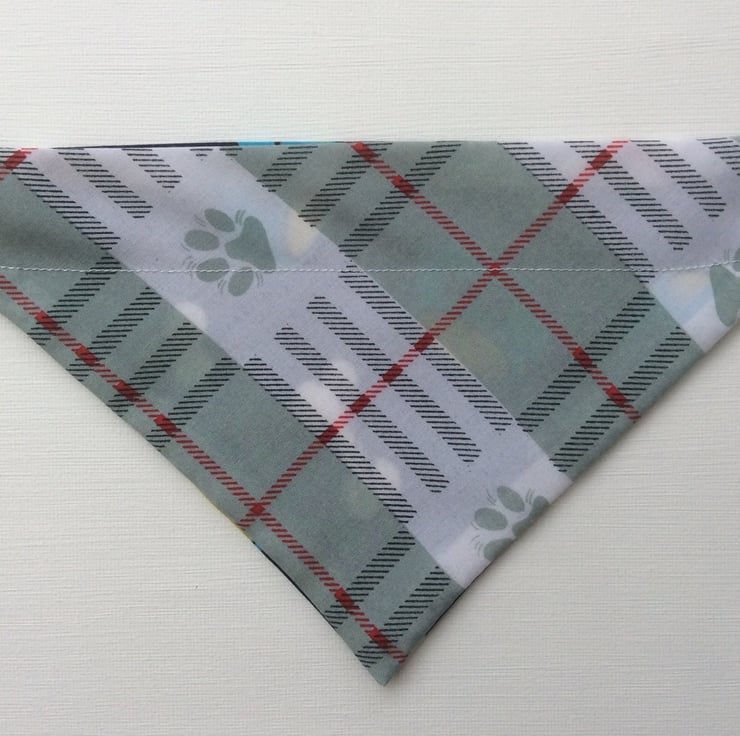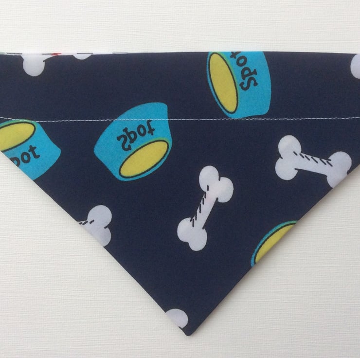 This bandana has, on one side, a sage green fabric with paw print motifs and on the other side it has a navy fabric with bowls and bones.