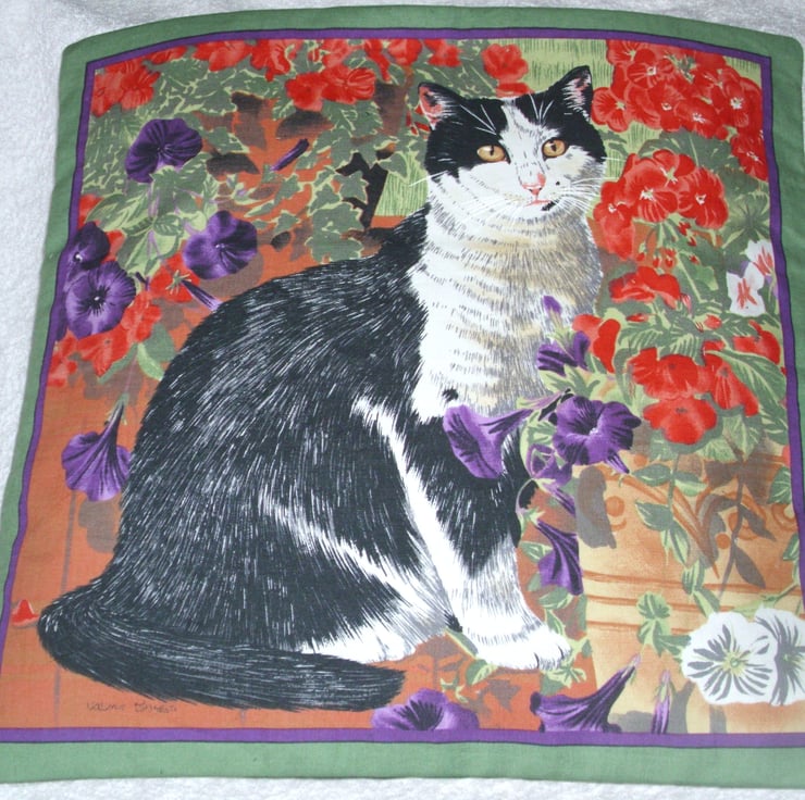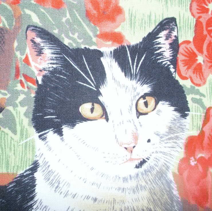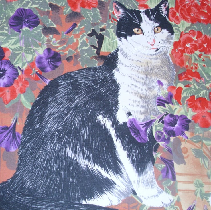 A square cushion of a lovely black and white cat in the garden with purple Petunias and bright red nasturtiums, would look good in any lounge, sitting room, study or office on any settee or armchair or in a conservatory or summer house or on a bed.