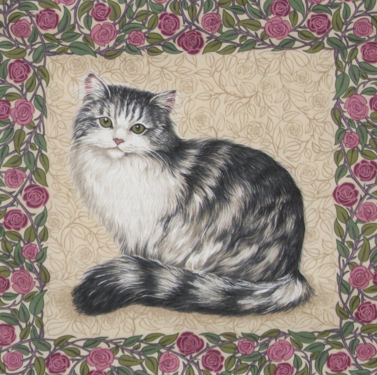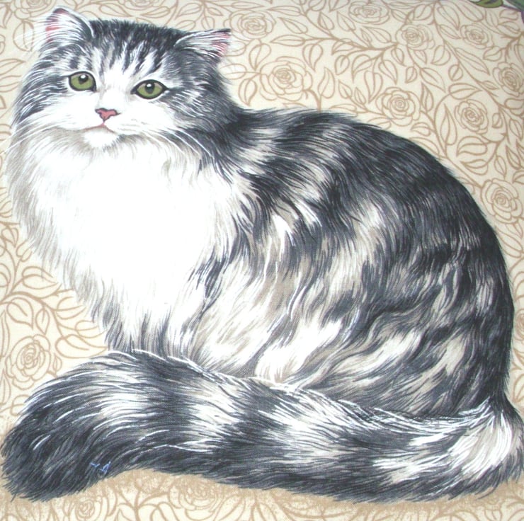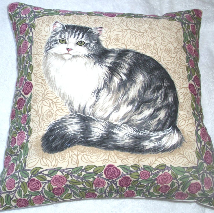 A square cushion with a very pretty grey tabby and white fluffy cat with lovely green eyes sitting in the middle with a border of pink roses . lovely and soft cushion ,would look good in any lounge, sitting room, study or office on any settee or armchair or in a conservatory or summer house or on a bed.