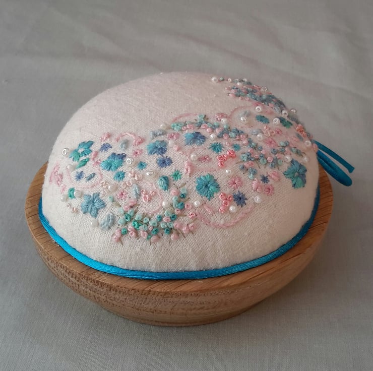 This one has been reduced as it is the last on the oak turned bases.and it probably doesn't have as dense embroidery as some of my newer pincishions but is perfectly made in every other way and as useful as my larger cupcake bowl pincushions. Just the last of its kind.