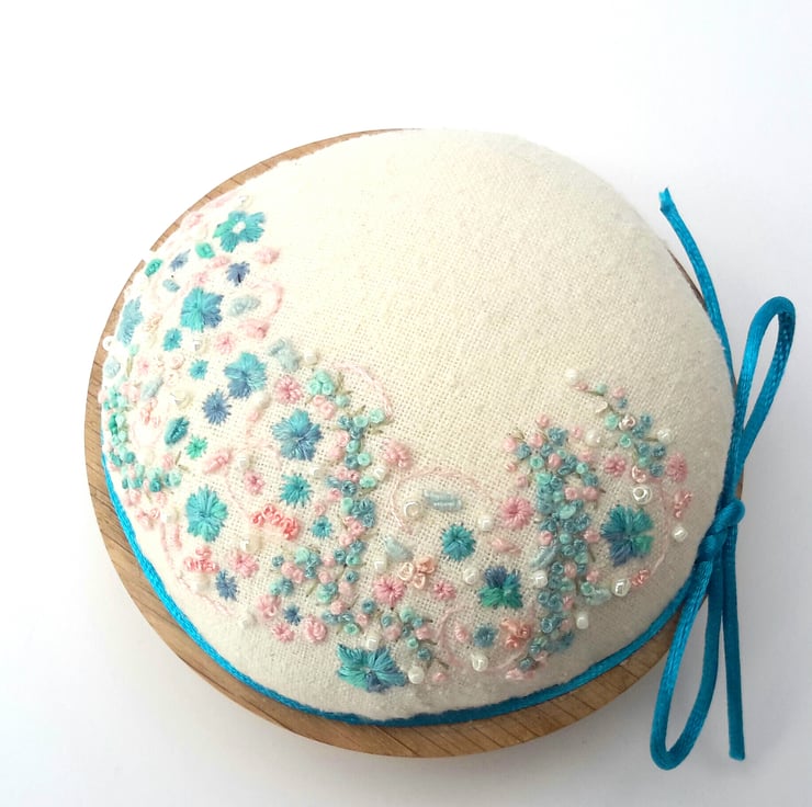 This is a unique design, a one of a kind hand embroidered pincushion in aqua's and pinks. Made from Natural silk noil fabric backed with cotton fabric.