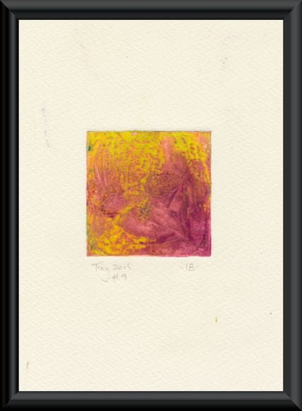This abstract collagraph print, is no 9 from a series called Tiny 2015. It is printed on Somerset paper mainly in Cadmium Yellow and Cobalt Violet with little flecks of green.