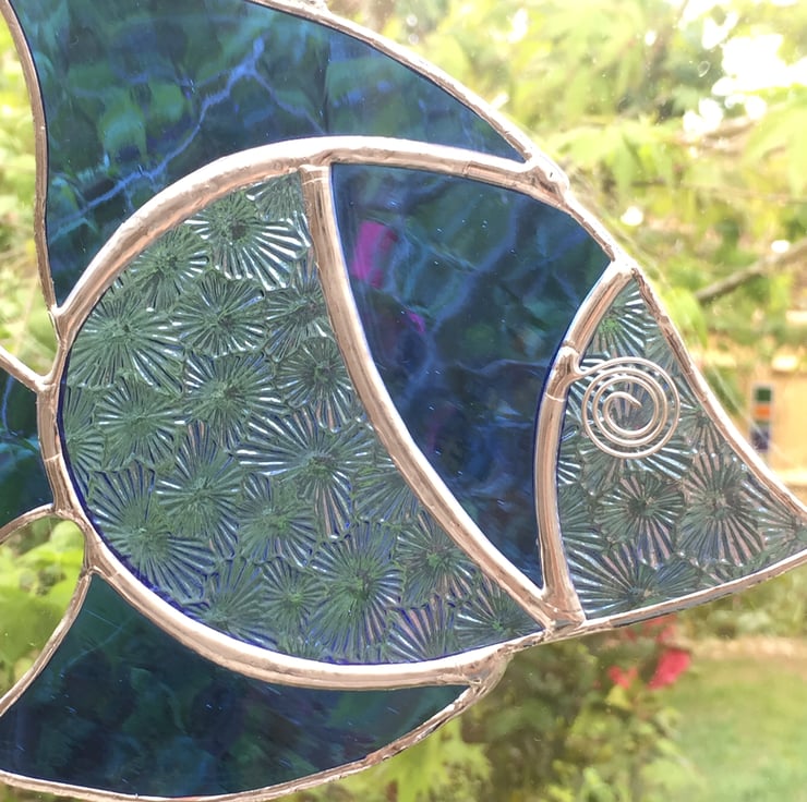 This fish has been made from blue water glass and Pale blue florentine glass. Each piece of glass has been copper foiled and soldered with a generous bead on the joints for added strength.