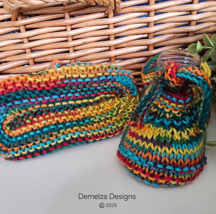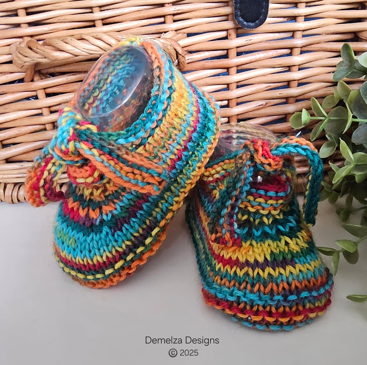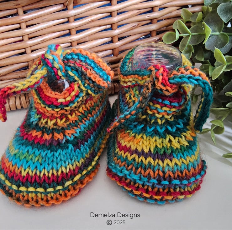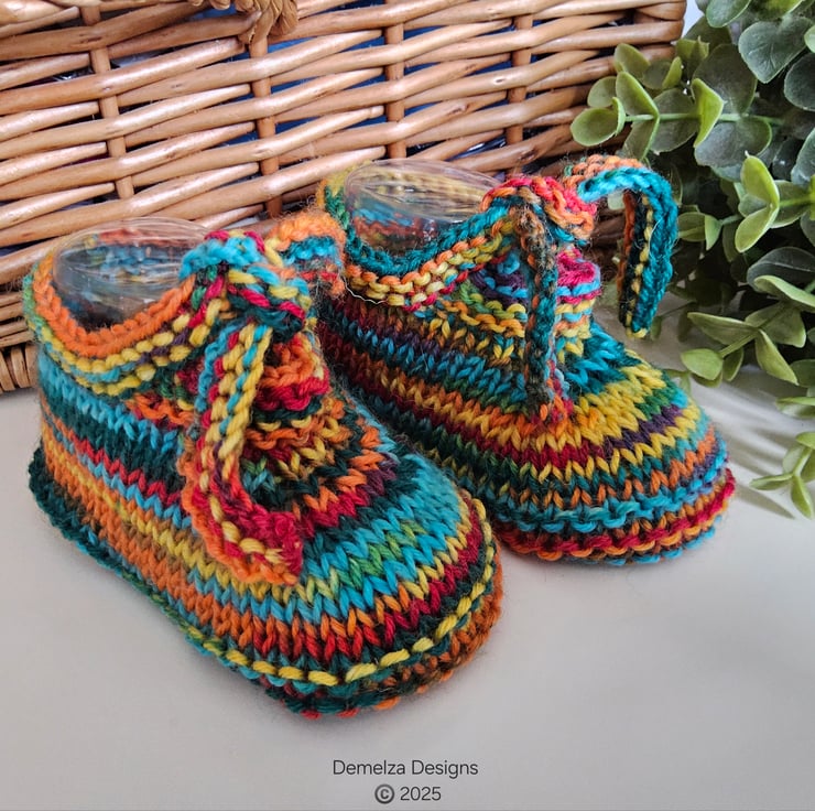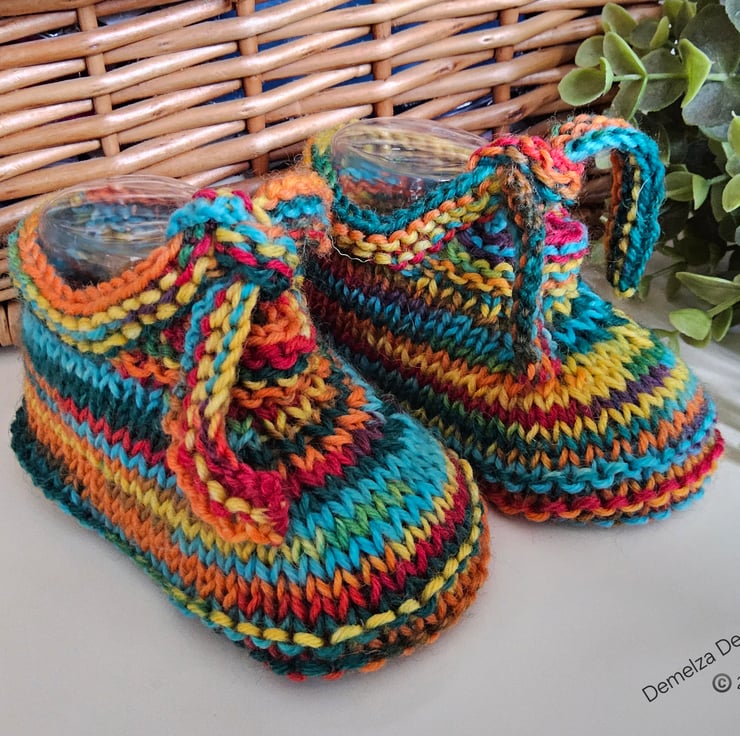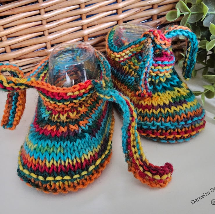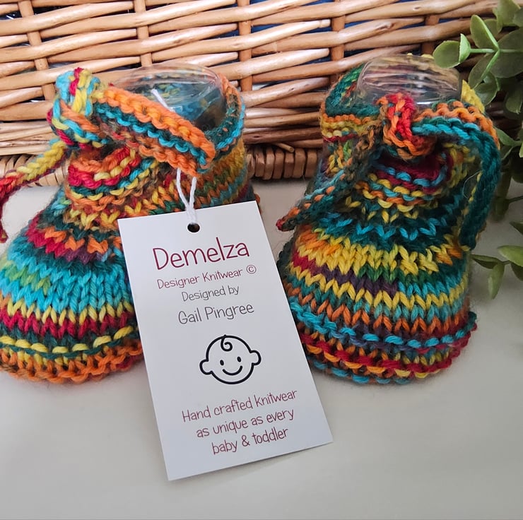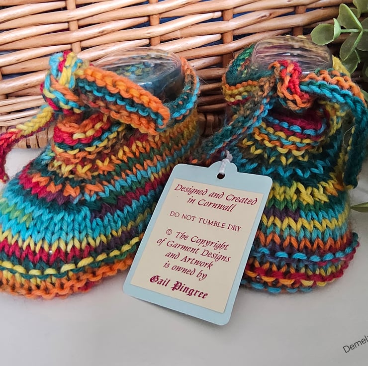 A sweet soft to touch pair of unisex baby booties/shoes lovingly designed and hand in Cornwall using top quality hand dyed yarn from a small yarn desiger which is guaranteed machine washable at low temperature settings. The yarn containing 75% pure new wool (merino). Natural fibre yarns are expensive to purchase, therefore making them ideal for those whom seek quality for their baby. The shoes will come presented with the designer Demelza garment label attached as proof of their origins if gifting.