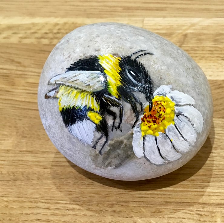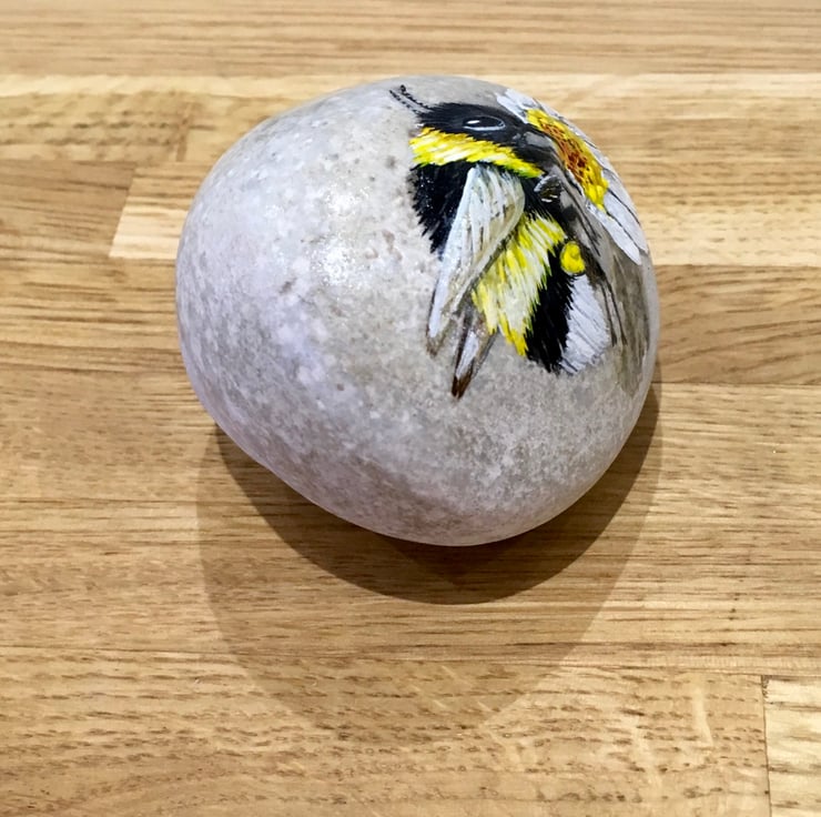 This bee has been painted using acrylics onto a smooth stone and glazed for a glossy protective finish