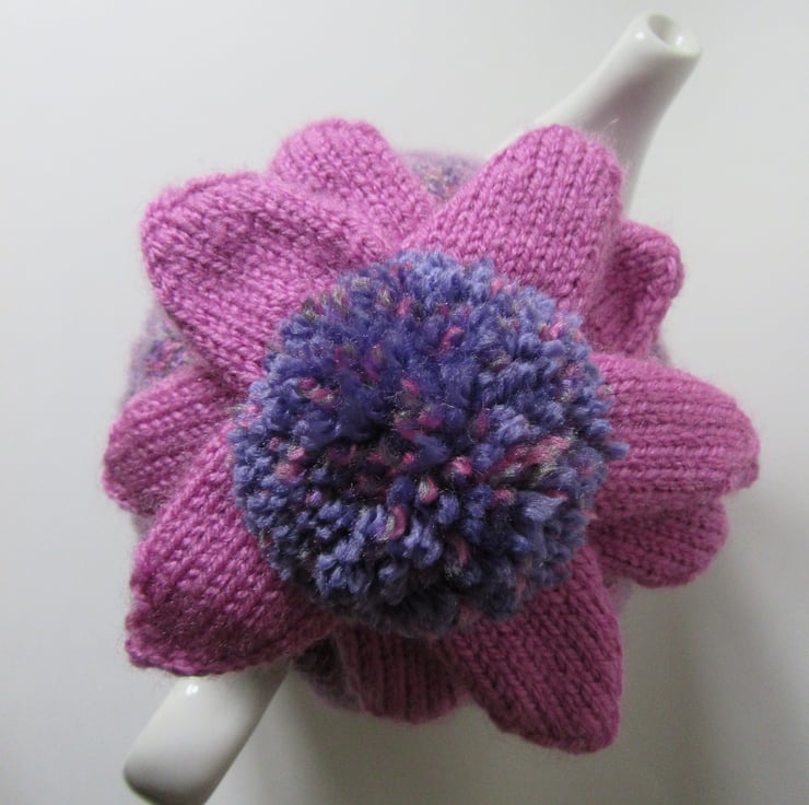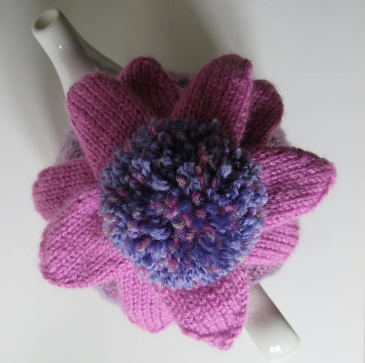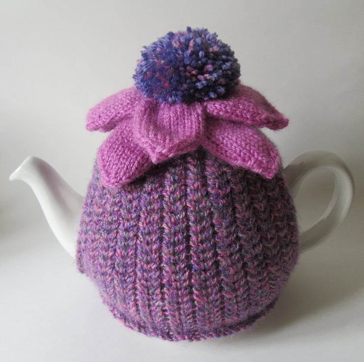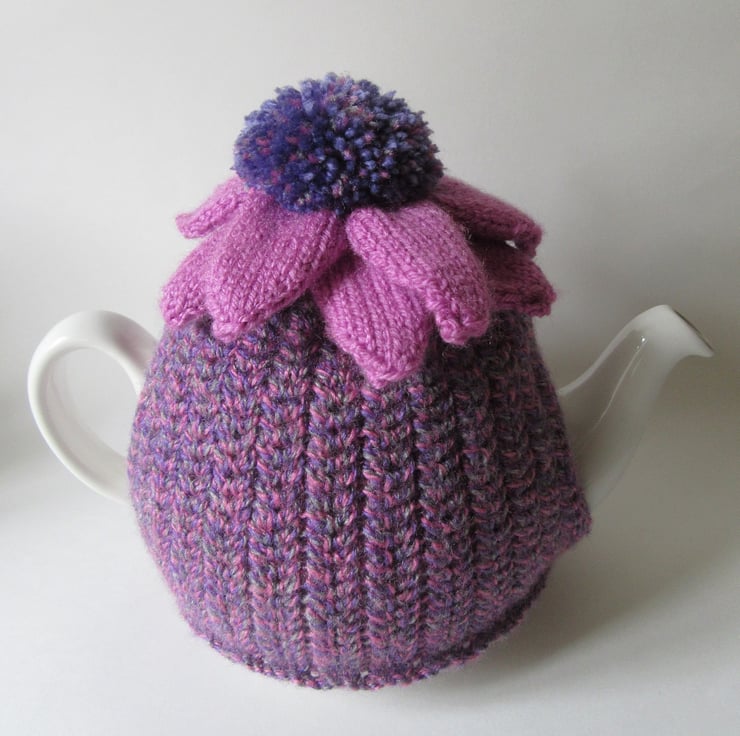 A beautifully hand knitted tea pot cosie with a knitted echinacea purpurea 'magnus' flower and pompom on the top. The body of the tea cosie is knitted in a purple and pink amethyst twisted melange yarn, using an all over 1960s retro stem stitch, giving a vertical texture to the cosie. This stitch allows the cosie to fit snugly around the pot, yet with enough ease for a swift removal when a top up is required. The tea pot handle peeps through the side opening so it dosnt get too hot to handle. On top there is a knitted echinacea flower using a hot pink coloured yarn for the double layer of petals and a purple and twisted melange yarn for the large pompom securely sewn onto the centre representing the 'cone' of the echinacea flower.
