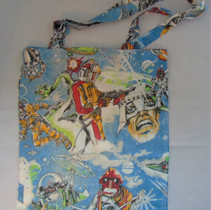 Bring some intergalactic charm to your errands with this quirky and colorful tote, upcycled from a vibrant vintage duvet cover. Bursting with retro sci-fi imagery, this bag is a bold nod to space-age style and sustainable living.