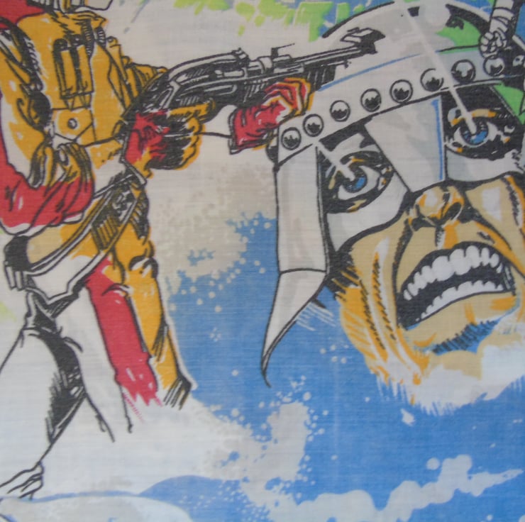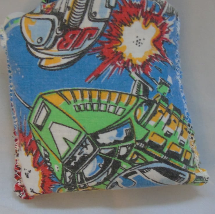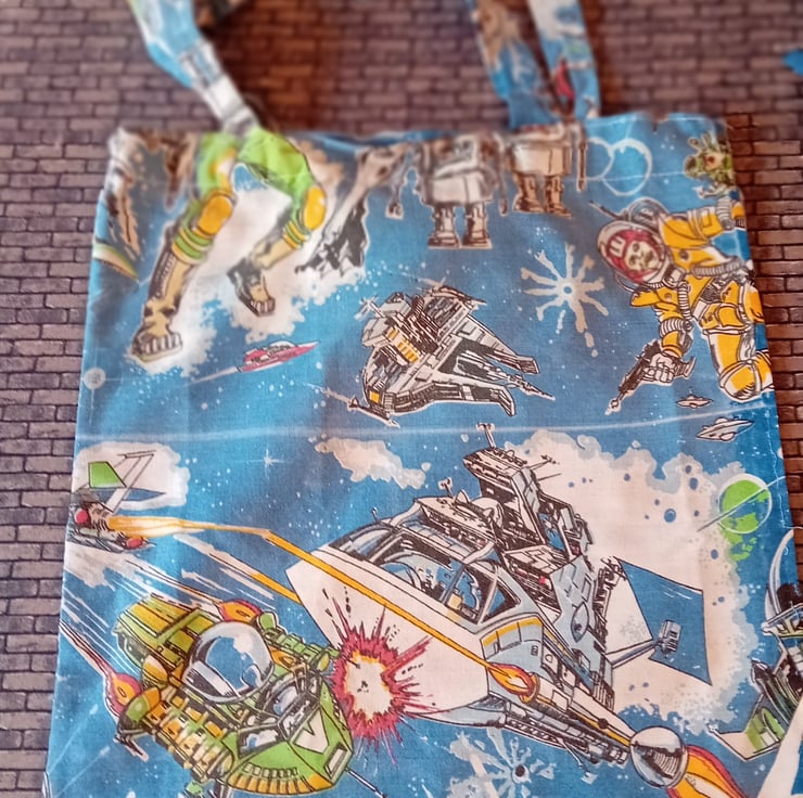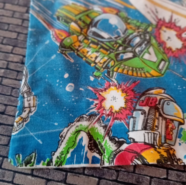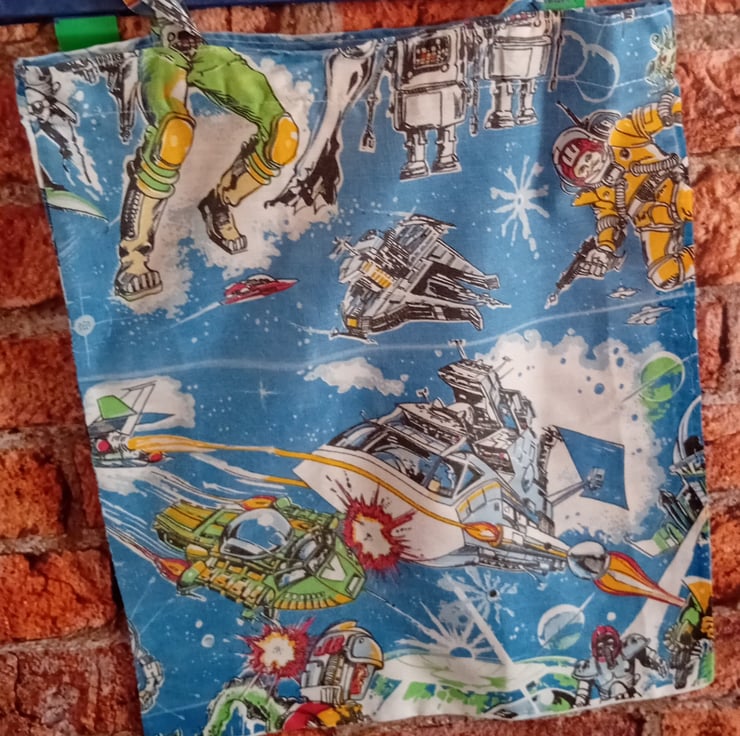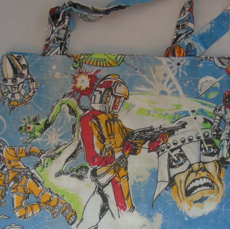 Bring some intergalactic charm to your errands with this quirky and colorful tote, upcycled from a vibrant vintage duvet cover. Bursting with retro sci-fi imagery, this bag is a bold nod to space-age style and sustainable living.