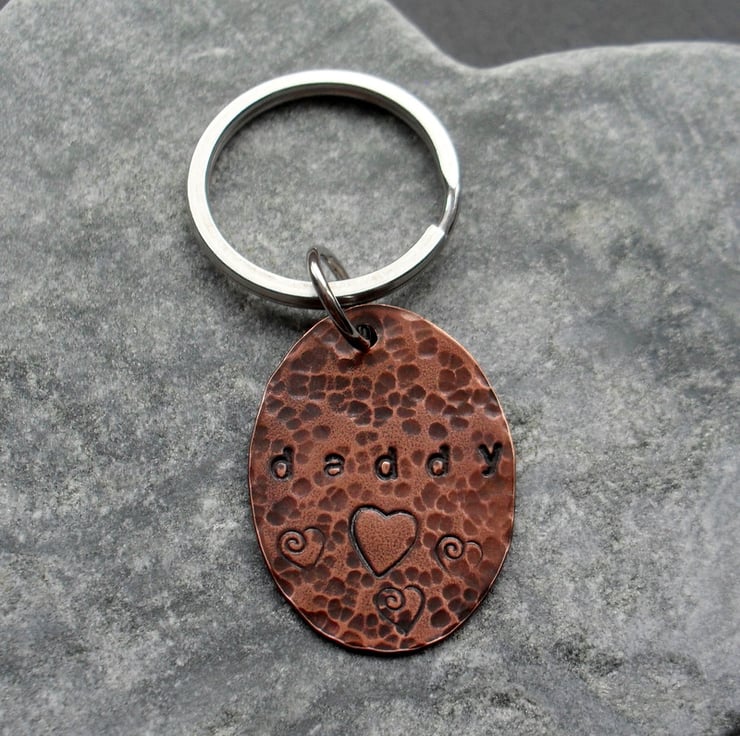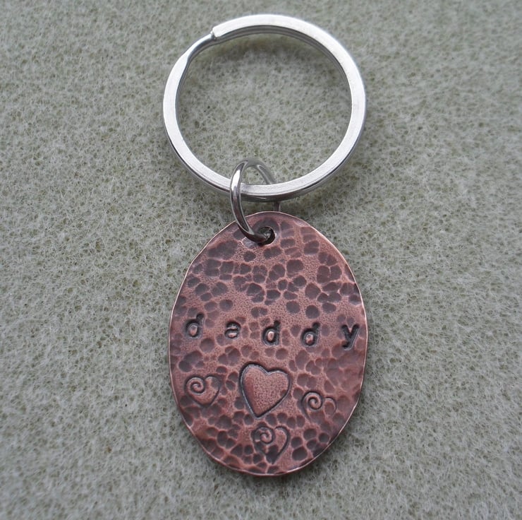 This keyring has been made with an oval shape being cut out of a piece of copper which has been hand stamped with daddy and hearts the copper has then been hammered to give texture and oxidised to give an aged look.