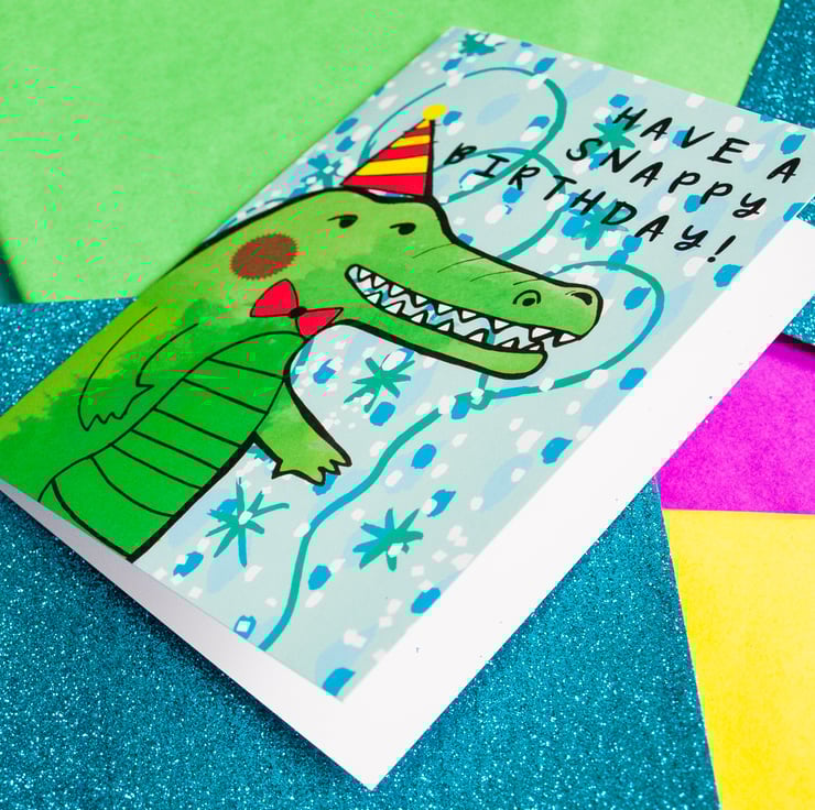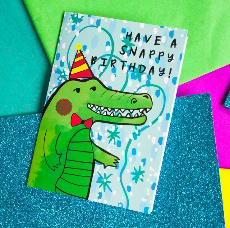 This is an original and unique illustrated birthday card of a cheeky croc donning a party hat designed by myself- perfect for little 'uns and grown ups! What a fun card to send to someone!