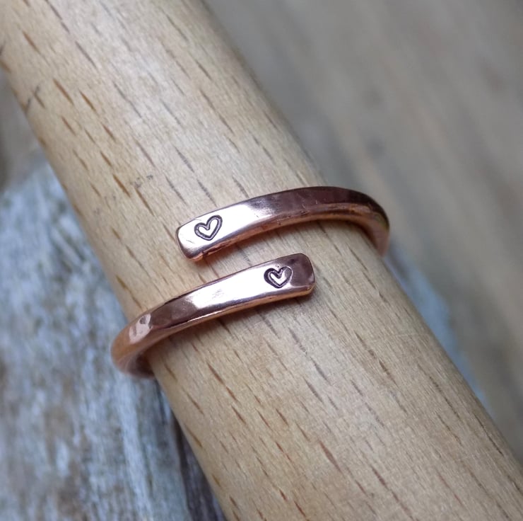 Made from 2 mm thick copper wire. Slightly flattened at each end off the ring and stamped with tiny hearts. This ring can be adjusted slightly a few quarter sizes either way for a perfect fit.