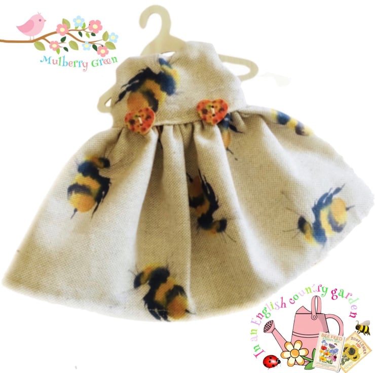 A beautiful little dress to fit the Mulberry Green characters. The dress is in a gorgeous bumble bee print on cotton but with the look and feel of linen. It has a very full skirt and a lined bodice and is decorated at the waist with two wooden heart buttons printed with wildflowers. It comes on a cute little wooden hanger.