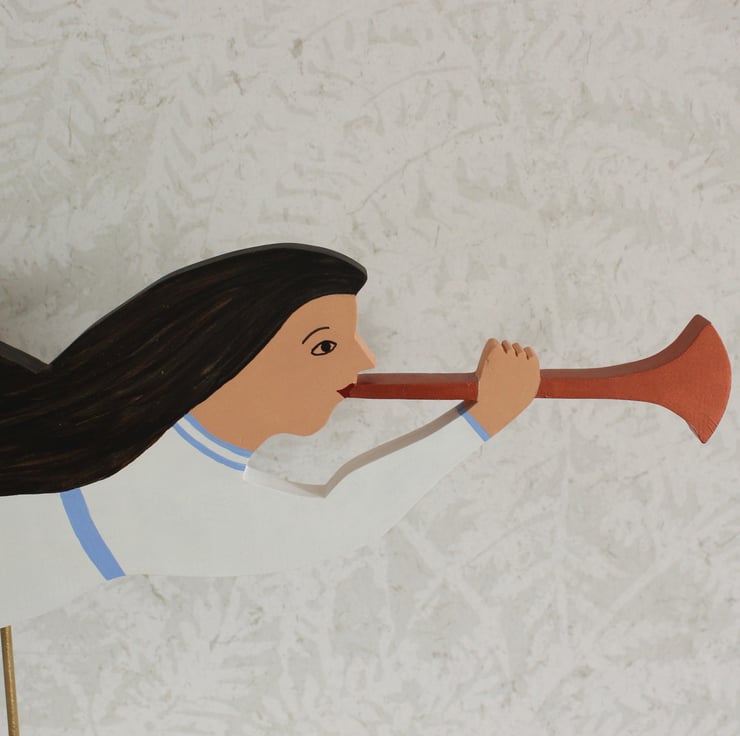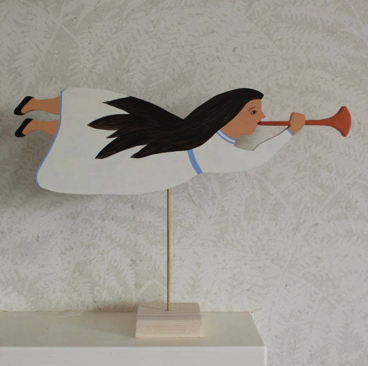 Just for a bit of fun I have made this American style folk art angel. It is cut from a sheet of 10mm sycamore (no MDF here) and mounted on a wood block with a brass rod. The angel is 11cm deep and 35 cm long and the height overall is 25cm approx. and it has been painted with artists acrylics.