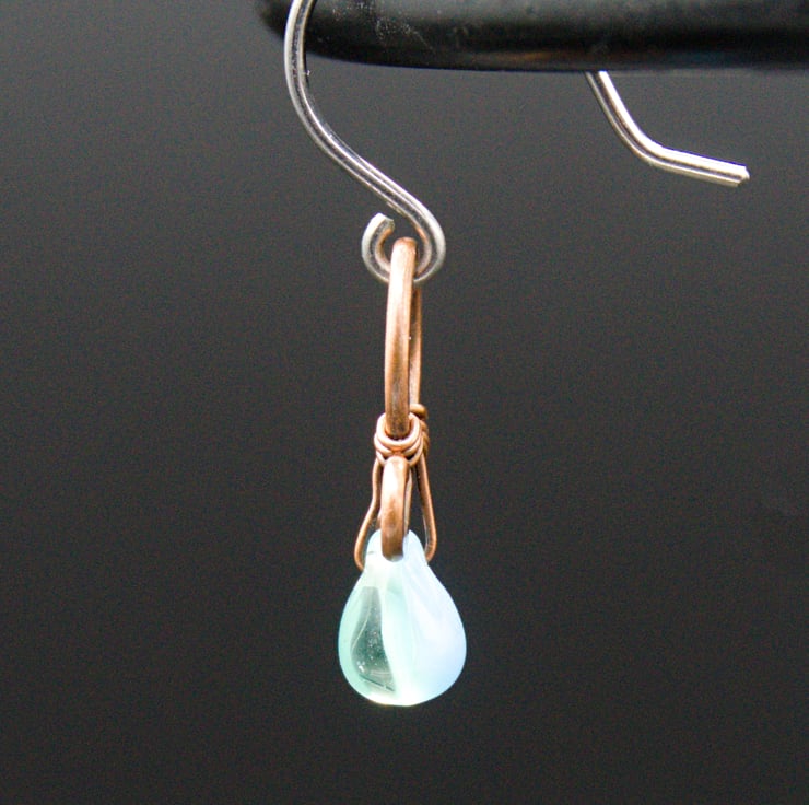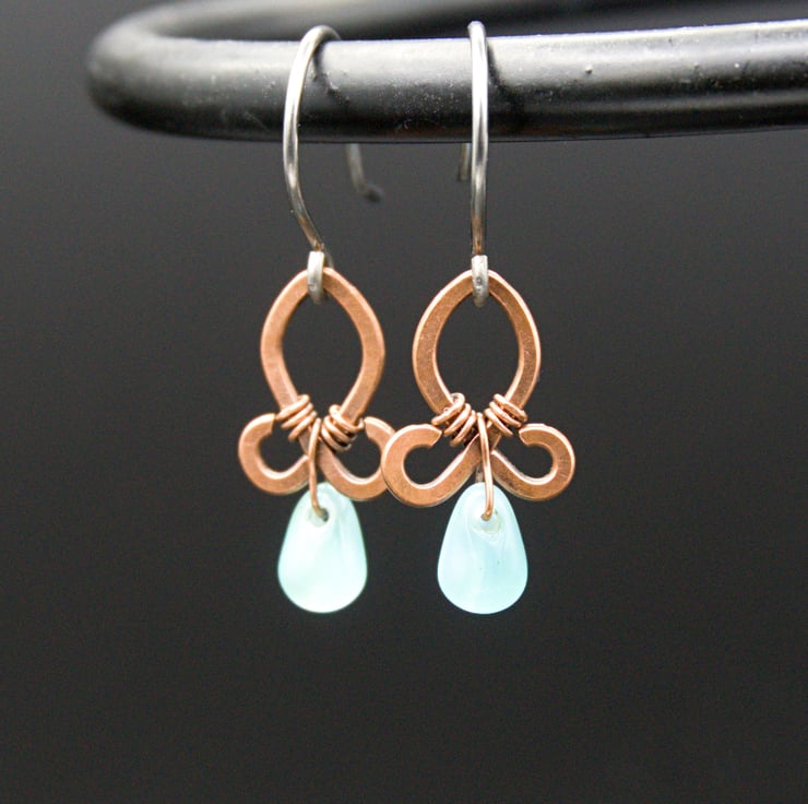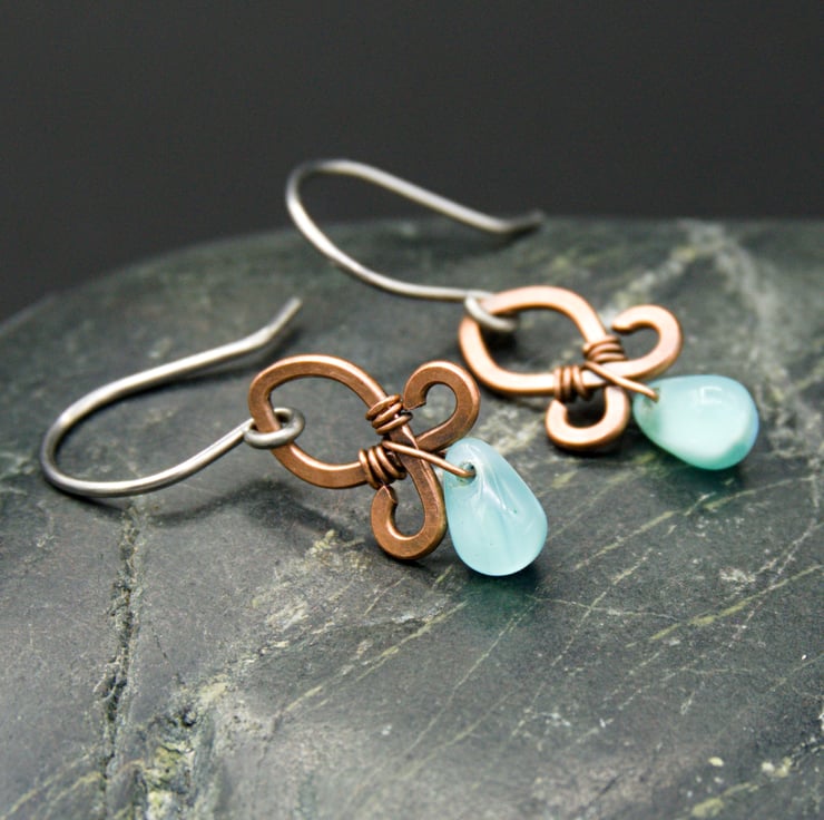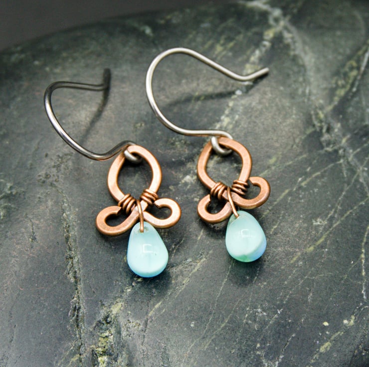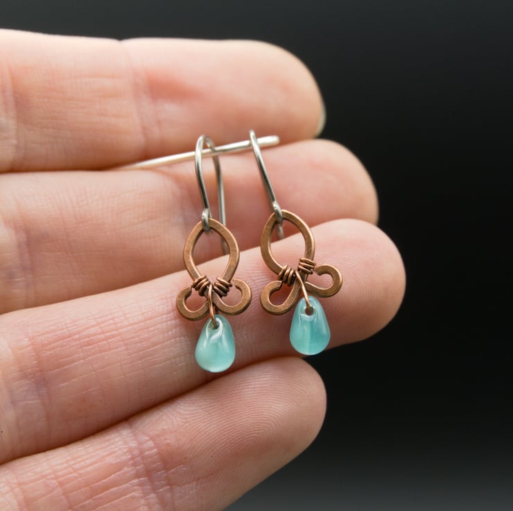 These gorgeous little earrings are made from copper wire, which has been shaped then hammered flat. I've then added little glass drop beads with very fine wire - the beads appear a light blue colour but they are actually clear glass at the front with blue glass behind (see fourth photo).