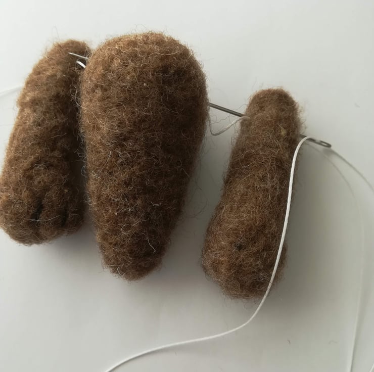 Wool, 2 felting needles, 2 sewing needles, foam pad, felting stick. Pearl thread, whipping twine.