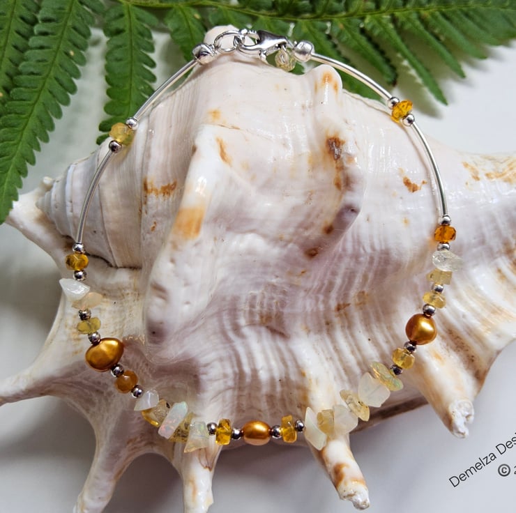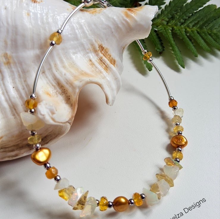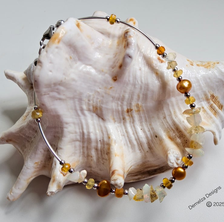 A beautiful bangle style bracelet designed and hand crafted in Cornwall using genuine Ethopian faceted roundels and nuggets complimented with golden freshwater culture pearls. As any light source hits the opals the item comes alive with a cool warm glow only displayed with quality opals. The freshwater pearls have a good shiller from their natural lacra formation.
