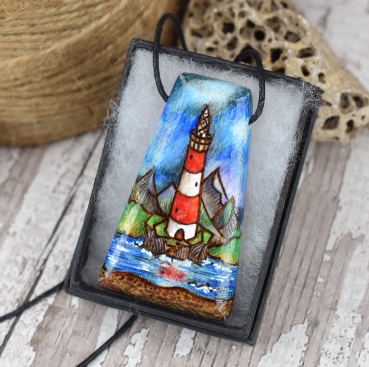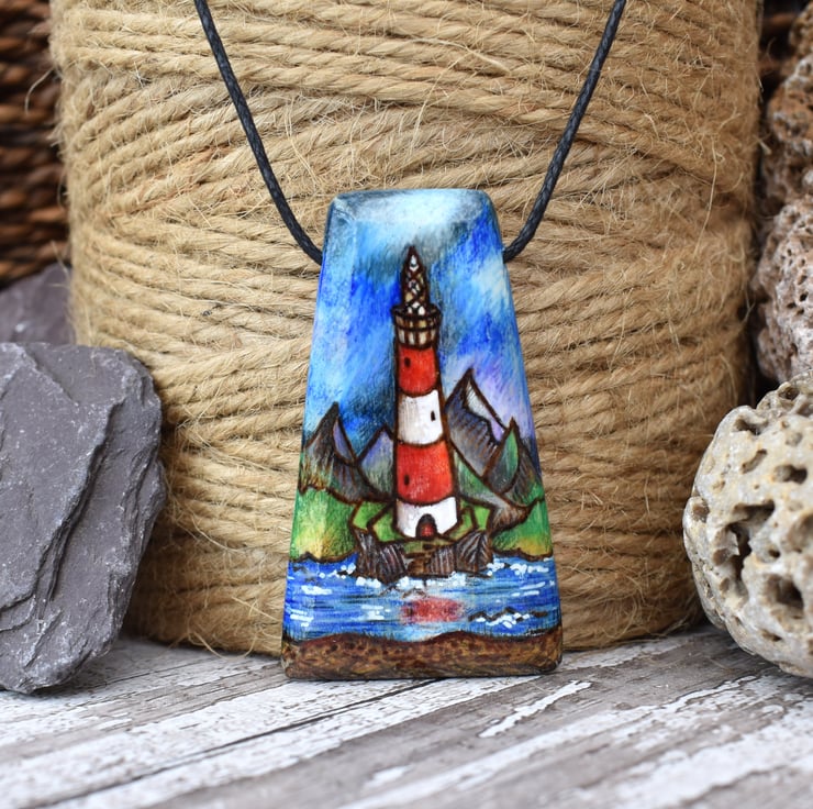 This striking lighthouse pendant has been decorated by hand using pyrography, and coloured using intense prismacolor pencils in red and white, and the surroundings in purples, greens and blues. It features a mountain range, seaside and a slightly stormy sky. It would make a great birthday or wood anniversary gift.