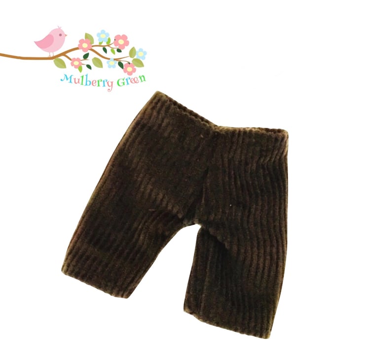 A little pair of nut brown cropped corduroy trousers made to fit the Mulberry Green characters. They are fashioned just like grown up ones and are made from a lovely soft brown cotton corduroy.