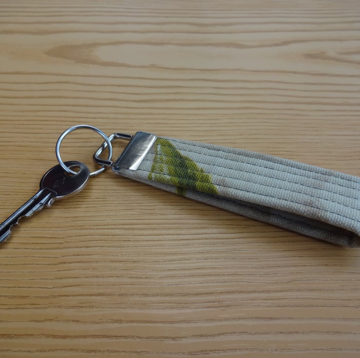 Handcrafted key ring made from cotton fabric with silver coloured hardware and split ring attached.