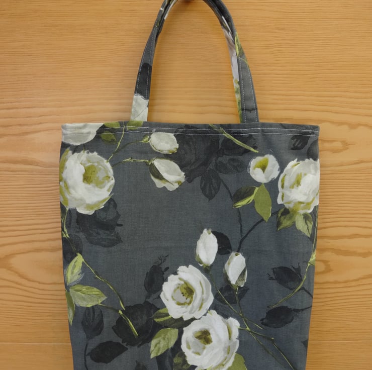 The main colour of the bag is a charcoal grey with cream flowers. The lining is a light duck egg blue colour.