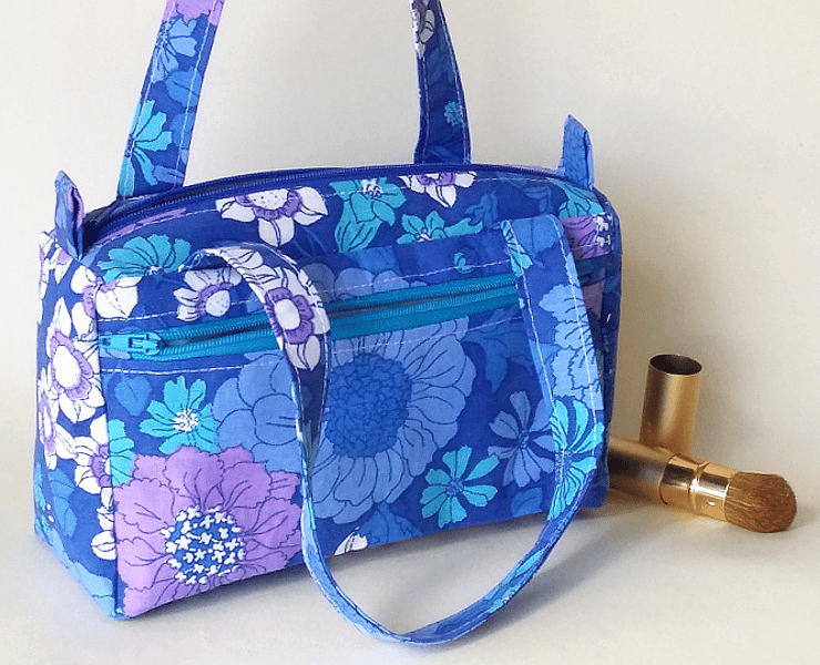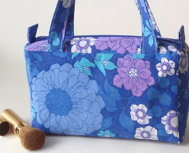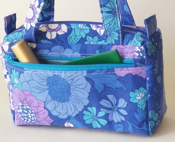 This is a cute, boxy handbag made out of a vibrant retro-style, floral fabric, with gorgeous shades of lilac and blue (royal blue, teal blue, pale blue, turquoise) and splashes of white. Though the bag is small, its boxy shape makes it roomy enough to carry your essentials. It can also be used as an organiser inside a larger bag.