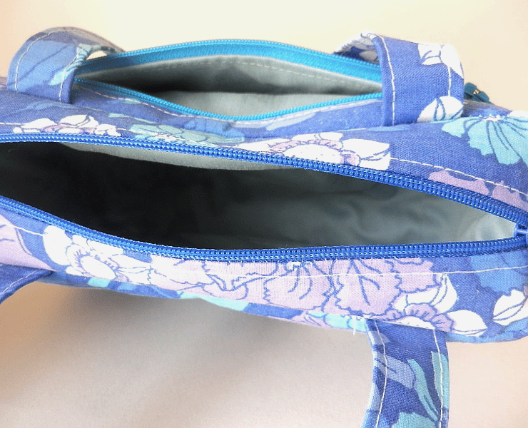The main compartment is zipped. It has an outer zipped pocket the length of the bag, which, to give you an idea of size, I can slip my 5.5 inch screen smartphone into. The lining is a pale blue colour. The zips are blue.