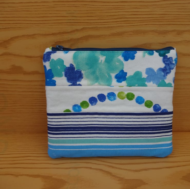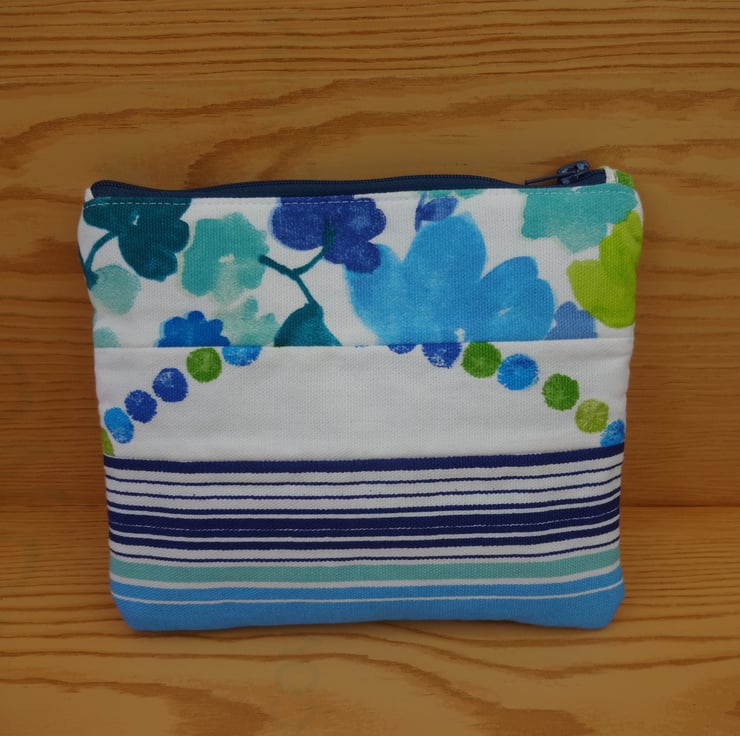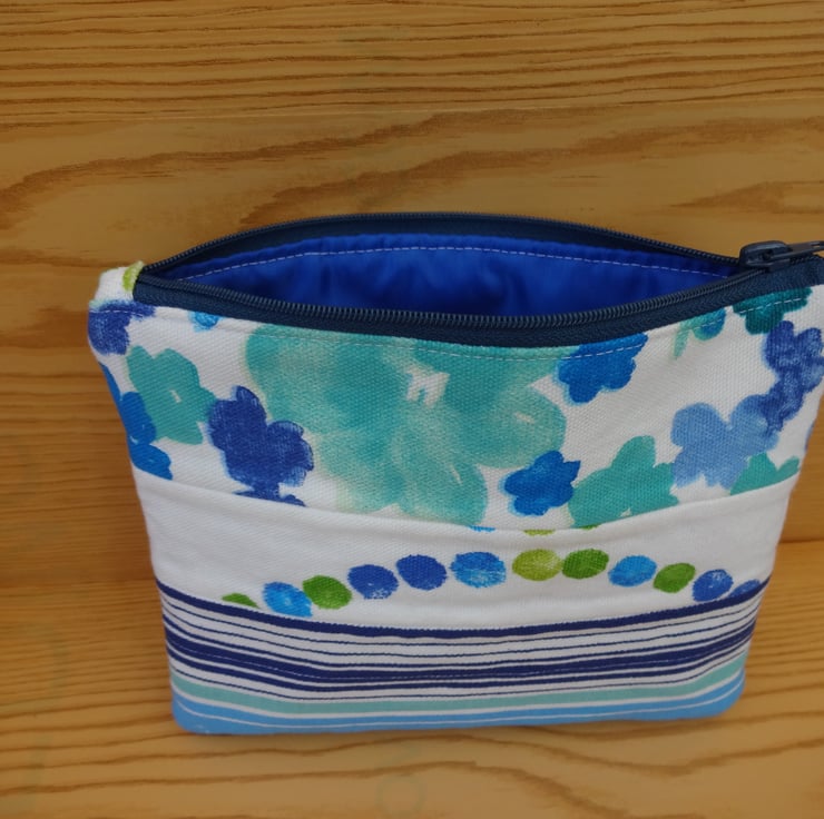 Nice bright coloured roomy handcrafted cosmetic bag which has a zipper along the top and has a wipeable blue lining.