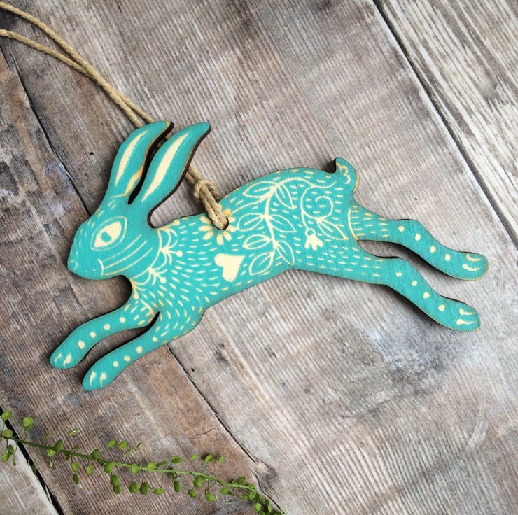 This hare is possibly a card you will want to keep! Cut from birch plywood (FSC certified), he is hand printed in a fresh turquoise blue with an original carved design and no two are the same. Measuring approximately 14cm x 8cm he comes strung to a plain white A6 card embossed with a sprinkling of daisies to leap over. Remove him and attach to a bag, purse, keyring to keep a spring in your step. Supplied with matching envelope and posted out to you within three hops and a jump.