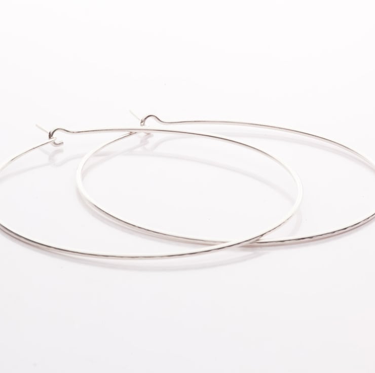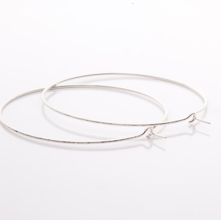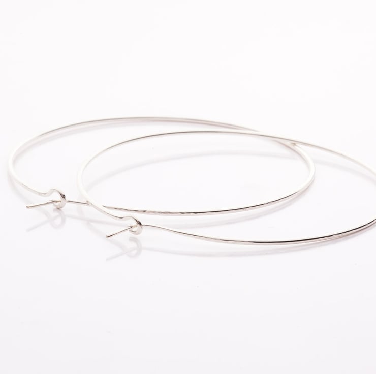 Handmade 925 Sterling Silver Large Hoop Earrings are made from 16 Gauge (1.30 mm) 925 Sterling Silver wire, hand forged and hand textured to approximately 58mm (2 1/4 inches) diameter. For the ear posts, they are hand filed to 20 Gauge (0.8mm) for a comfortable fit. The earrings have been tumbled for strengthening and a polished, smooth finish.