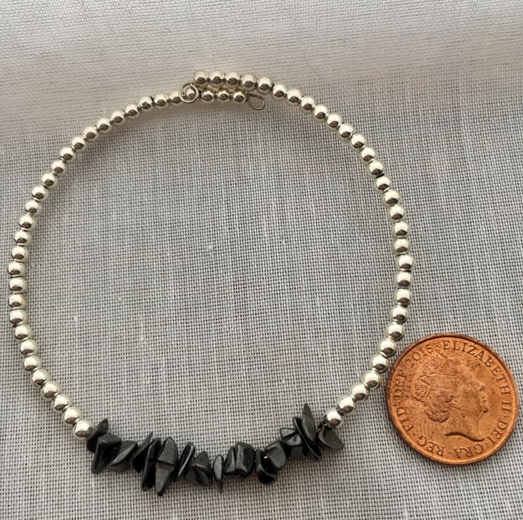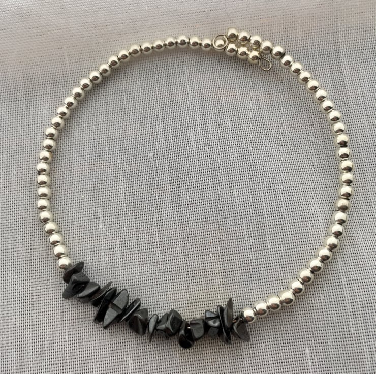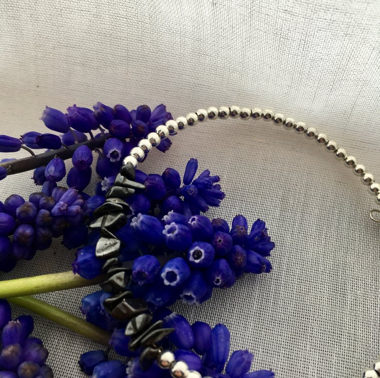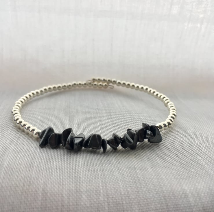 A dainty stacking bracelet featuring silver plated beads to add sparkle and haematite to add contrast. Ideal on its own, it wouldn’t look out of place with a business casual outfit, or stack it with others (the labradorite and opalite stacking bracelets (also available) would give a cool monochrome look) to give a punchier feel.
