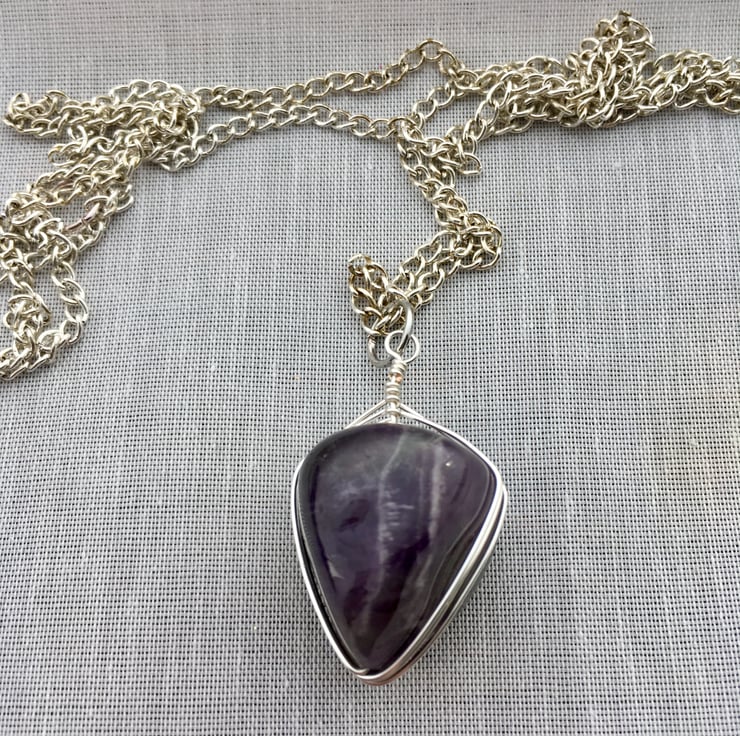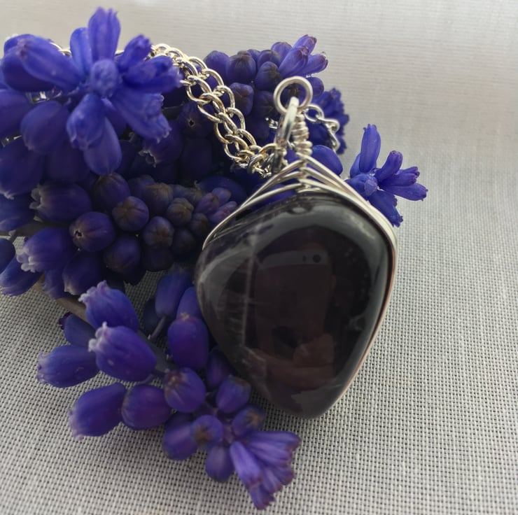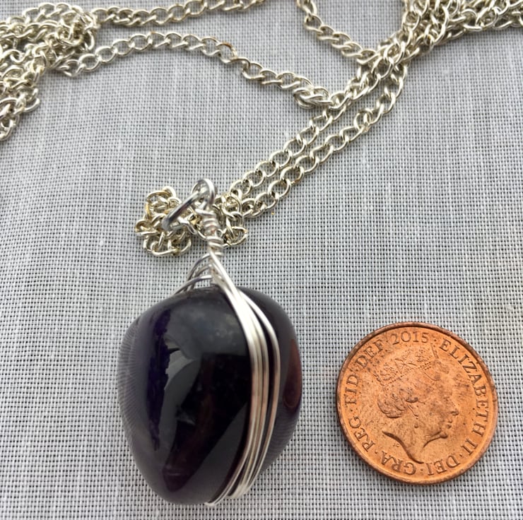 A beautiful deep purple, substantial, amethyst nugget wrapped in silver plated wire on a 34in chain. This will look great with your summer maxi dresses as the long chain elongates the body and the simple design allows the stone to shine.