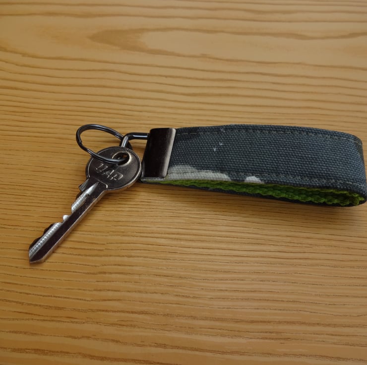 Handcrafted key fob where the inside has been lined with lime green cotton webbing.