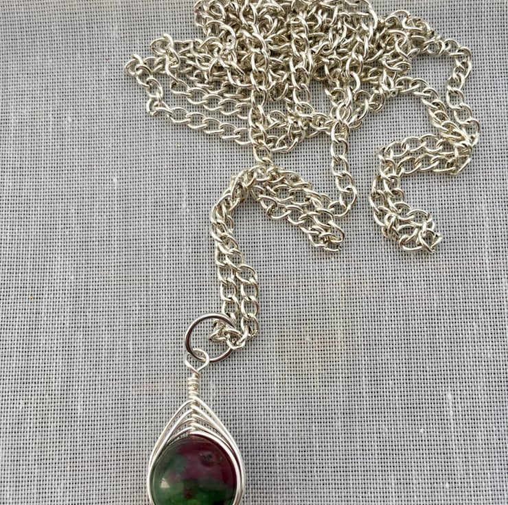 A lovely example of ruby zoisite wrapped in silver plated wire and suspended from a 36in chain.