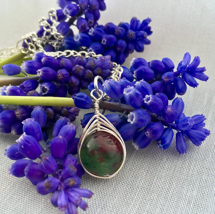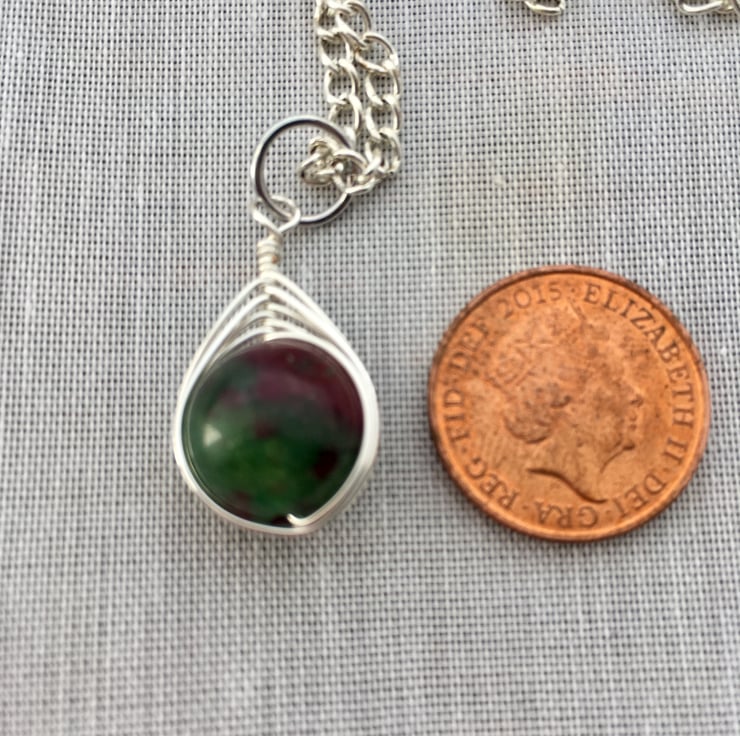 The ruby zoisite bead is 10mm in diameter and the pendant is approx. 2.5cm from the top of the wrapped loop that attaches it to the chain.