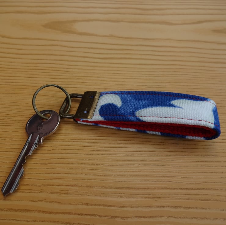 Handcrafted key fob which has been inner lined with bright red cotton webbing and has red top stitching.